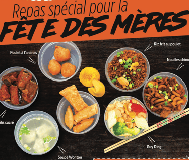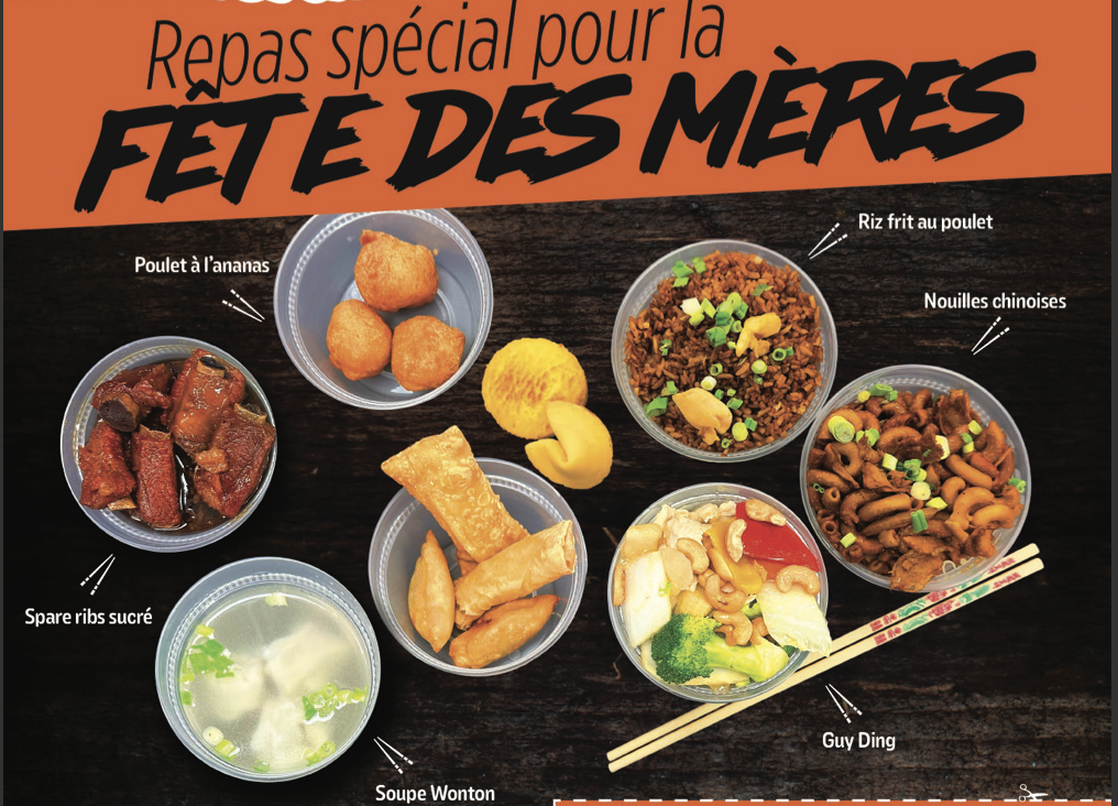 Nouilles chinoises au porc, Riz frit au poulet, Spare ribs à l'ail, poulet à l'ananas, Guy Ding, Soupe won ton, Egg roll, rouleaux impériaux et dumpings.